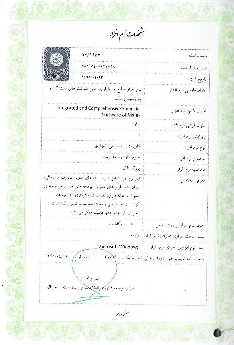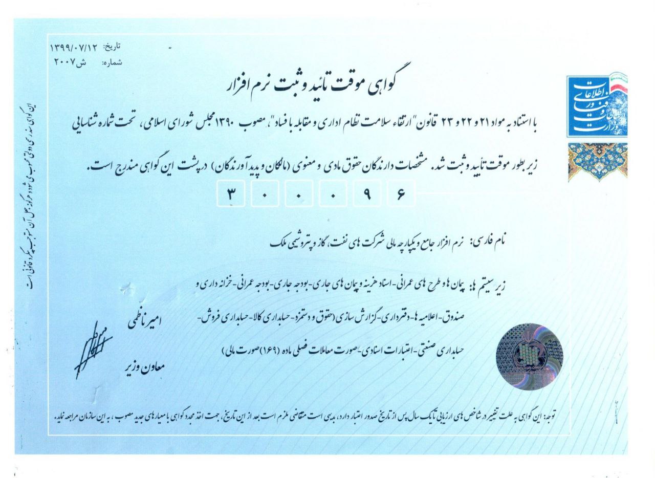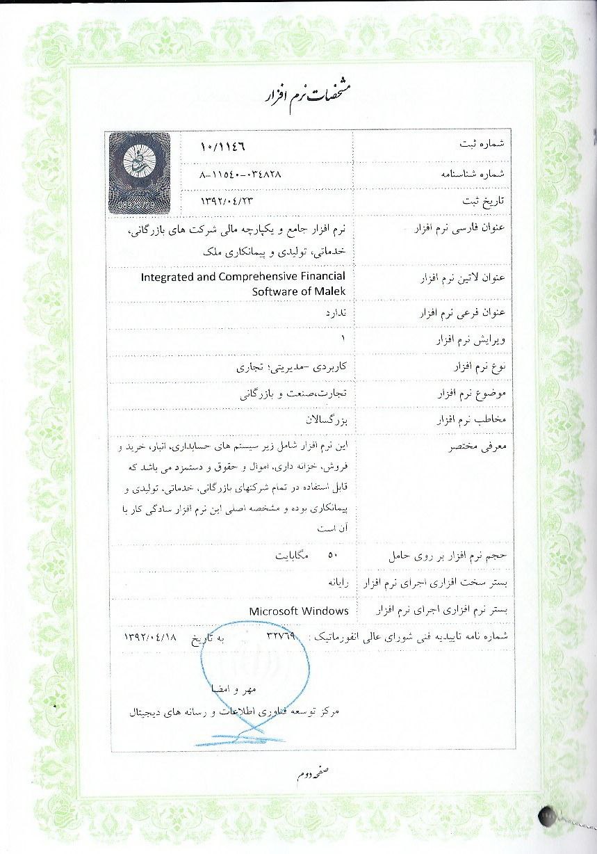 ملك با استفاده از تجارب ارزشمند خبرگان حسابداري و حسابرسي، بهترين مهندسين نرم افزار، خبره ترين تحلیلگران سیستم و تلفيق آن با دانش روز، موفق به توليد تخصصي ترين نرم افزارهاي جامع و يكپارچه مالي در حوزه شركتهاي نفت، گاز و پتروشيمي شده است. همچنين اين شركت افتخار توليد نرم افزارجامع و یکپارچه مالی مخصوص شركتهاي بازرگاني، توليدي، خدماتي، پيمانكاري در سطح کوچک ،متوسط و بزرگ و كشتارگاهها و فروشگاههای کوچک ،متوسط و بزرگ زنجیره ای و نرم افزار آموزشی حسابداری مخصوص دانشجویان دانشگاهها را دارد.